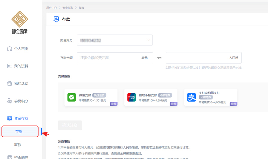 3 为御金国际 MT5账号注资,请于御金国际MT5用户中心左侧菜单中选择「资金存款」,填写注资至MT5账号的存款金额,然后点击「提交」,按页面提示完成注资。 交易细则